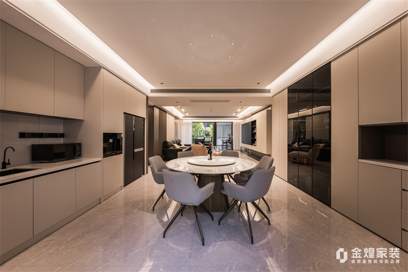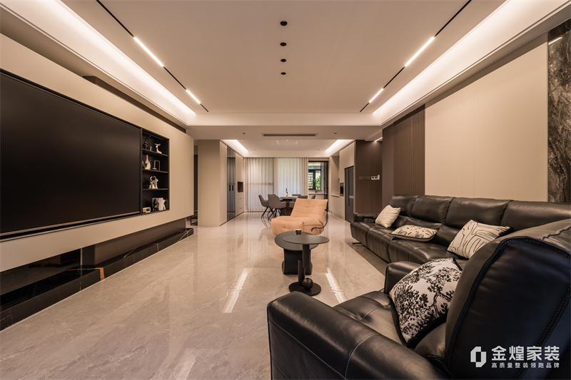本案整体以意式轻奢为主基调,去客厅化,结合轻奢主义打造意式简约空间,整体运用了木饰面、硬包以及岩板等不同材质的碰撞,空间沉稳大气,质感十足。