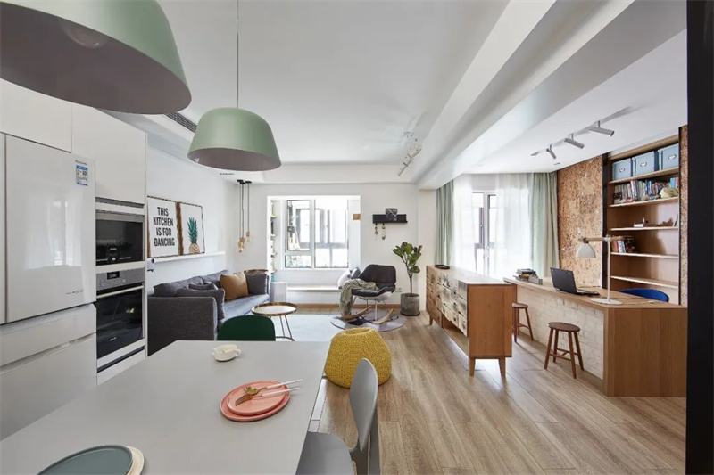 客厅是本案的亮点,白色墙壁为空间提供了明亮的背景。客厅的地板是原木色,赋予了房间自然的温暖感。墙上装饰着一些抽象的艺术画作,为空间带来些许艺术氛围。整个客厅的设计强调了开放感和清晰的线条,让人感到宽敞和时尚。