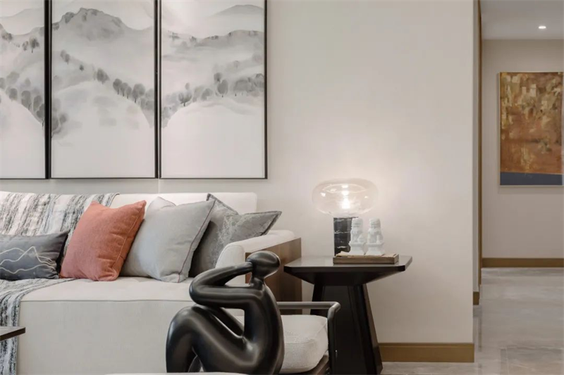整个客厅以浅色为主调,巧妙地搭配深色家具和传统中式摆件,营造出优雅别致的氛围。中央摆放一张红木茶几,而沙发背景墙则装饰着一组水墨山水画,将宁静和谐的氛围完美呈现。