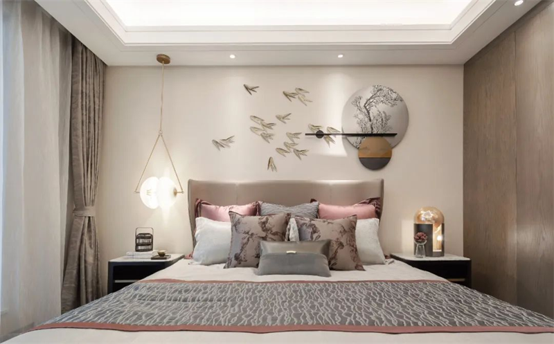 主卧传统的中式元素与现代的简约设计完美结合,呈现出典雅与舒适的空间氛围。东方韵味的床头背景装饰,加上简约时尚的吊顶和灯饰,融合了新中式和现代元素,呈现出独特的古典美感。使整个空间在保留传统文化精髓的同时,更显现代时尚。