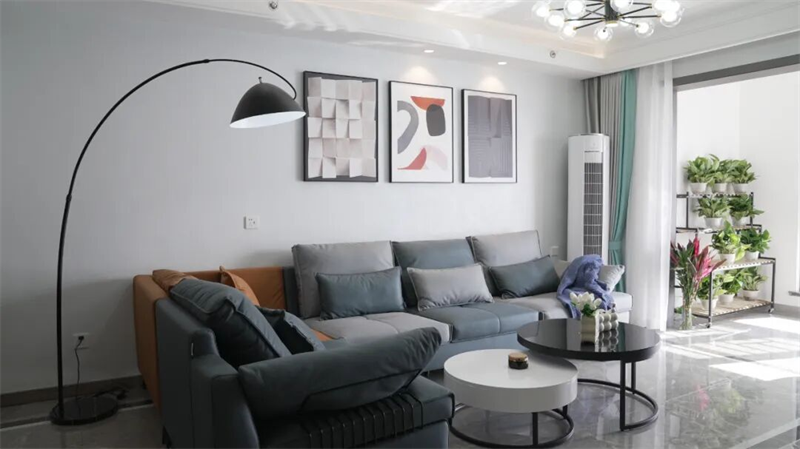 墙面三幅抽象艺术挂画错落有致,为空间注入艺术气息,与弧形落地灯共同勾勒出柔和的光影节奏。大面积浅色墙漆与通透采光相辅相成,让整个空间明亮开阔。一旁绿植点缀的阳台区域,将自然生机引入室内,赋予生活更多呼吸感。