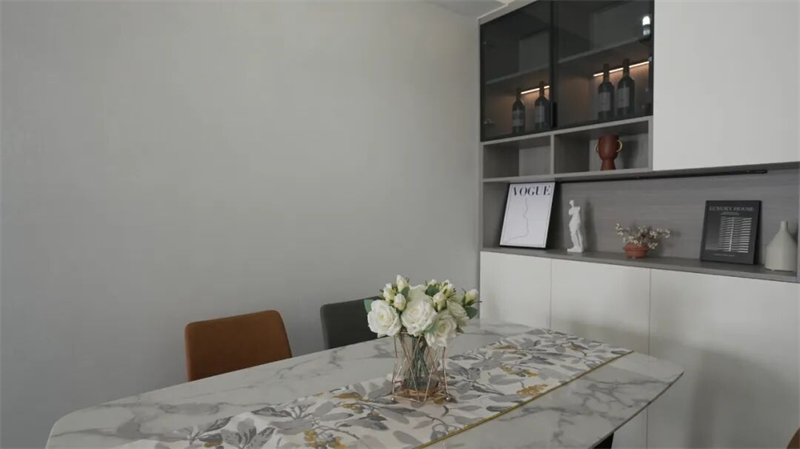 餐厅以极简线条勾勒出优雅的用餐氛围,大理石纹理餐桌搭配柔和色调的餐椅,营造出轻盈而高级的空间质感。背景墙定制收纳柜采用无把手设计,整体简洁利落,兼具美观与实用功能——玻璃门酒柜内嵌灯带,低调展示收藏美酒,增添生活仪式感。开放式置物格点缀艺术摆件与绿植,让细节充满温度。
