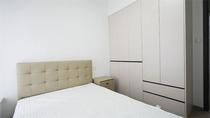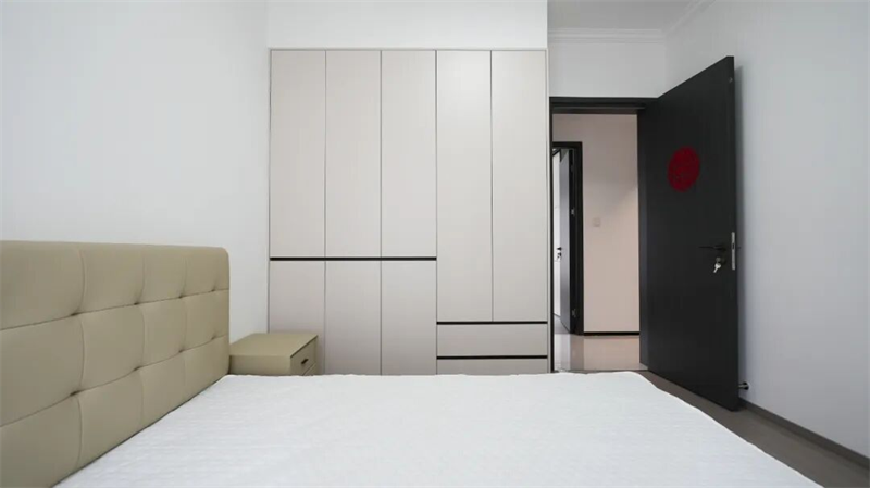 次卧延续整体现代简约风格,以克制的色彩与利落的线条营造出安静、整洁的休憩氛围。整面墙定制衣柜,以浅色柜门配黑色装饰线条,简洁大方又不失设计感,有效提升收纳能力的同时保持视觉清爽。床侧小巧床头柜实用而不占空间,满足日常置物需求。